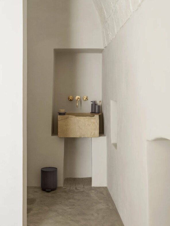 Den matta ytan ger ett exklusivt uttryck och gör att hinken smälter in naturligt i en modern badrumsmiljö.