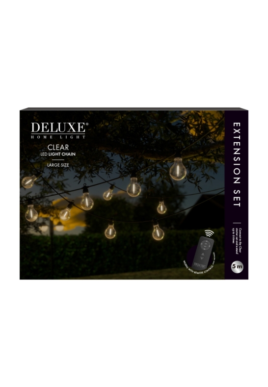 Extra LED ljusslinga 5 meter med 10 lampor som passar till startsetet DH-CLEAR-S0002 LED Ljusslinga Clear Starter set Large. Ljusslingan kan användas både inomhus och utomhus då den är vattentät (IP44).