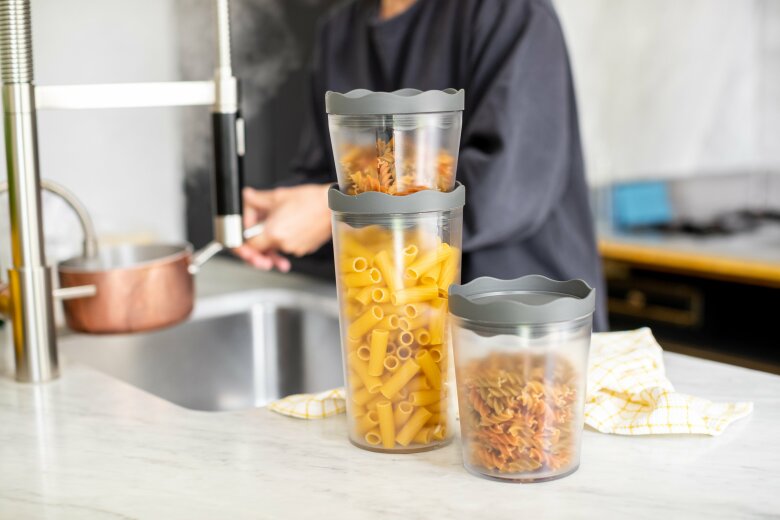 Setet består av tre storlekar – stor, mellan och liten – anpassade för allt från basvaror till snacks och torringredienser.